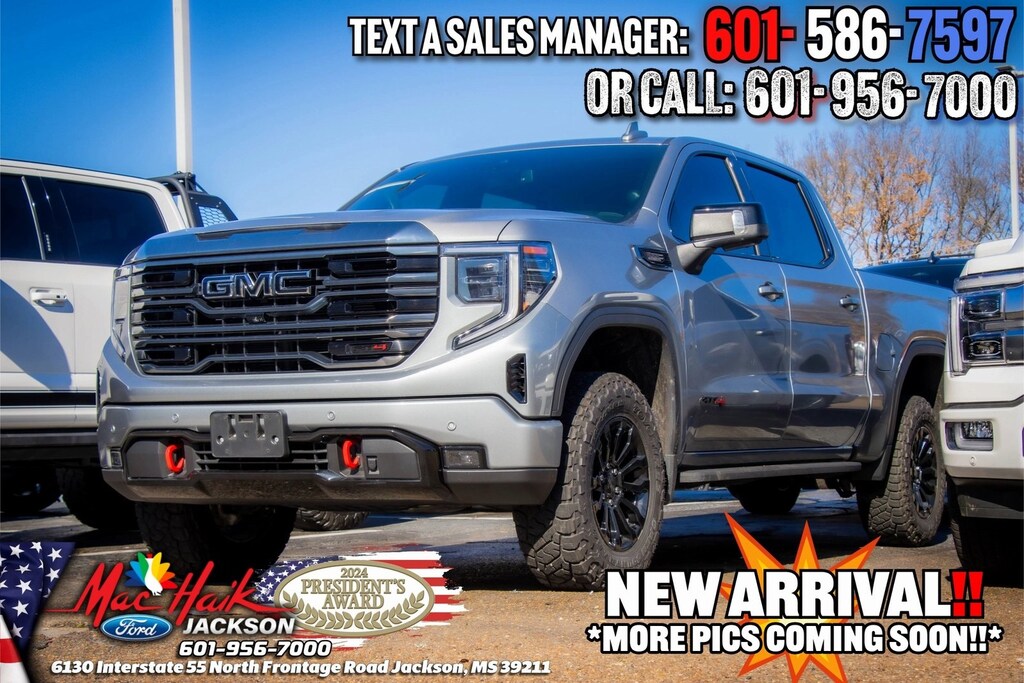 Sterling Metallic 2023 GMC Sierra 1500 AT4 4WD 10-Speed Automatic 3.0L I6 Sierra 1500 AT4, 4D Crew Cab, 3.0L I6, 4WD, Sterling Metallic, Jet Black With Kalahari Accents Leather, 120-Volt Instrument Panel Power Outlet, 2 Charge/Data USB Ports Inside Center Console, 2 Type-C Charge-Only Rear USB Ports, 2 USB Ports, 220 Amp Alternator, Adaptive Cruise Control, AT4 Preferred Package, AT4 Premium Package, Auto-Locking Rear Differential, Black Chrome Header & Grille Insert Bars, Color-Keyed Carpeting Floor Covering, Compass, Deep-Tinted Glass, Electric Rear-Window Defogger, Electrical Steering Column Lock, Floor-Mounted Center Console, Front Prem Floor Liners w/Removable Carpet Insert, Front Rainsensing Wipers, GMC Connected Access Capable, HD Surround Vision, Heated 2nd Row Outboard Seats, Heated Driver & Front Outboard Passenger Seating, Heavy-Duty Air Filter, Hill Descent Control, Hitch Guidance w/Hitch View, In-Vehicle Trailering App, Integrated Trailer Brake Controller, Keyless Open & Start, LED Cargo Area Lighting, Navigation System, Off-Road High Clearance Step (LPO), OnStar & GMC Connected Services Capable, Perimeter Lighting, Power Door Locks, Power Front Passenger Windows w/Express Up/Down, Power Front Windows w/Driver Express Up/Down, Power Rake & Telescoping Steering Column, Power Rear Windows w/Express Down, Power Sliding Rear Window w/Rear Defogger, Preferred Equipment Group 4SB, Premium Bose 7-Speaker Sound System, Push Button Start, Rear Cross Traffic Braking, Rear Pedestrian Detection, Rear Wheelhouse Liners, Red Recovery Hooks, Remote Vehicle Starter System, SiriusXM w/360L, Spray-On Pickup Bed Liner w/AT4 Logo, Steering Wheel Audio Controls, Theft Deterrent System (Unauthorized Entry), Trailer Camera Provisions, Trailer Side Blind Zone Alert, Trailering Package, Ultrasonic Front & Rear Park Assist, Universal Home Remote, Ventilated Driver & Front Passenger Seats, Wi-Fi Hotspot Capable, Wireless Charging, Wireless Phone Projection.