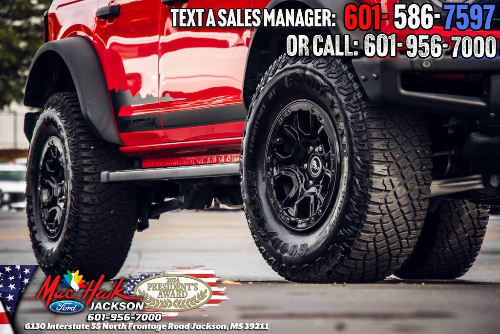Race Red 2022 Ford Bronco Wildtrak 4WD 10-Speed Automatic 2.7L EcoBoost V6 Bronco Wildtrak, 4D Sport Utility, 2.7L EcoBoost V6, 10-Speed Automatic, 4WD, Race Red, Black Onyx Cloth, 12 LCD Capacitive Touchscreen w/Swipe Capability, 2 Smart Charging USB Ports In Dashboard, 360-Degree Camera, Adaptive Cruise Control, Additional Sound Deadening, Connected Built-In Navigation, Equipment Group 354A Lux Package, Evasive Steering Assist, Front Parking Sensors, Heated Steering Wheel, Information on Demand Panel, Radio: B&O Sound System by Bang & Olufsen, Sideview Mirrors, Universal Garage Door Opener, Wireless Charging Pad.